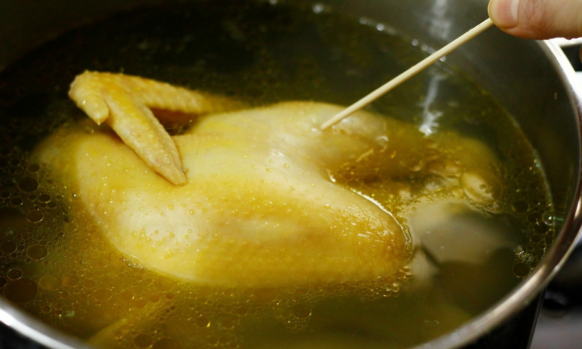 Khi luộc gà, phần đùi là nơi có nhiều thịt dày, bên cạnh đó còn chứa nhiều gân và mạch máu, do đó nó khó chín hơn so với các bộ phận khác. Nếu khi chọc vào mà thấy nước tiết ra màu đỏ, điều đó chứng tỏ thịt vẫn chưa chín hoàn toàn. Ngược lại, nếu nước trong, có nghĩa là gà đã đạt đến độ chín cần thiết.